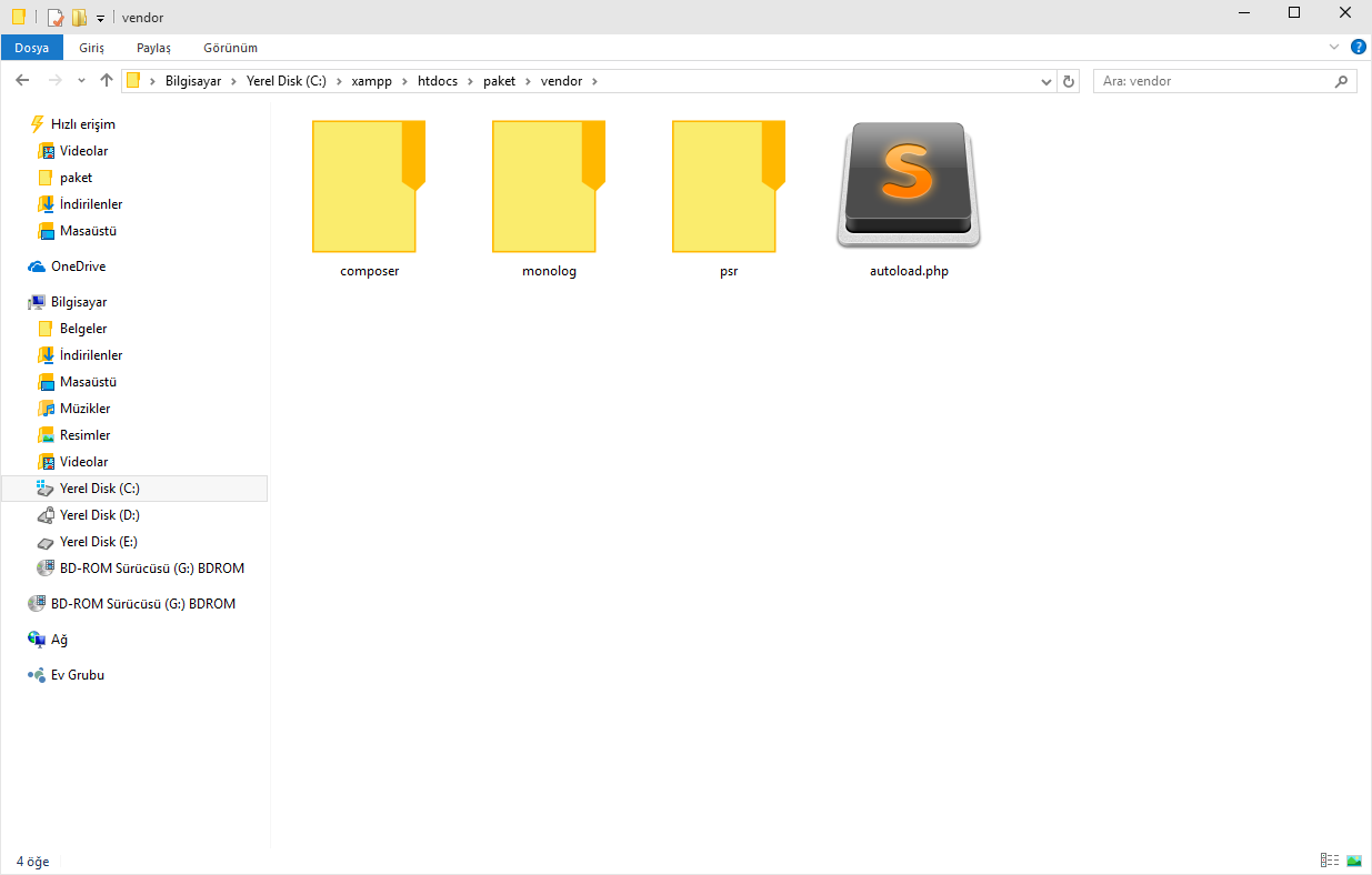 Composer ile en çok yüklenen paket olan "monolog" kütüphanesini yükleyelim. Terminal yada Komut İstemini açın projenizin kök klasörüne gidin. Ardından aşağıdaki kodu çalıştırın.